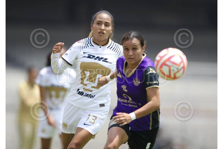 Paola Chavero de Pumas y Havi Ibarra de Mazatlán disputan un balón durante el partido de fútbol Pumas vs Mazatlán correspondiente a la jornada 1 del Torneo Apertura 2022 de Liga BBVA MX Femenil, en el estadio Olímpico Universitario.