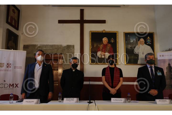 Pedro Villobos, Ricardo Valenzuela Pérez, Paola Félix Díaz, Favid Hernández ofrecieron rueda de prensa para dar a conocer diversos recorridos turísticos por la Catedral Metropolitana por los festejos del Día de los Muertos.