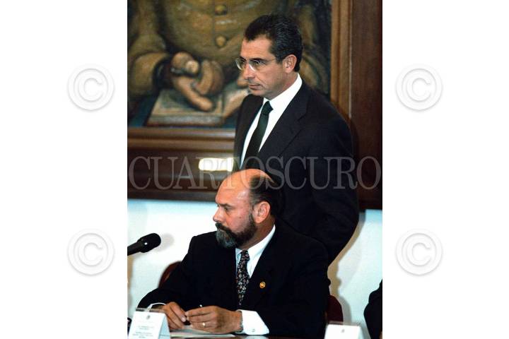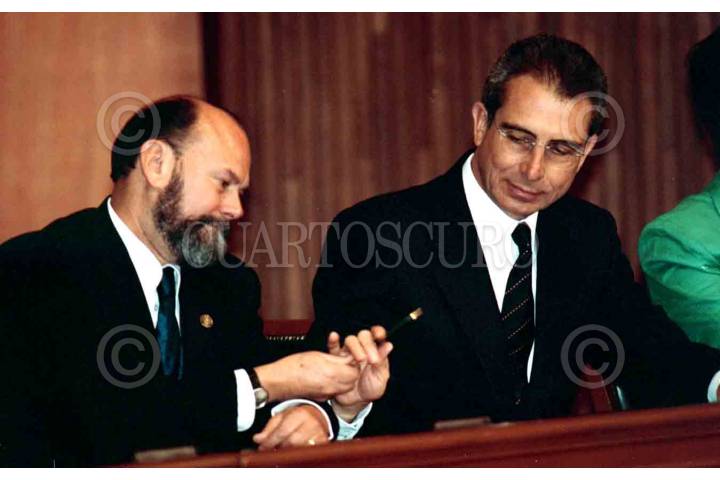 MEXDF12MAYO2004.- José Paoli sub secretario de Gobernación conversa con Lorena Villavicencio asambleista perredista, asistieron a la firma un convenio para el diseño de una urna electrónica entre el IEDF y la UAM, ITESM y IPN. FOTO: Germán Romero/CUARTOSCURO.COM