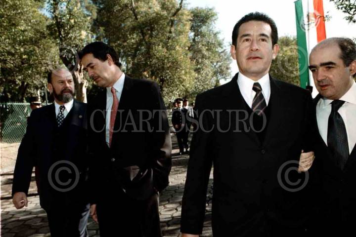 Francisco José Paoli Bolio, Fernando Lerdo de Tejada, Diódoro Carrasco y Luis Tellez, platican al término de la ceremonia de conmemoracion de la Marcha de la Lealtad, en la Pérgola del Castillo de Chapultepec.