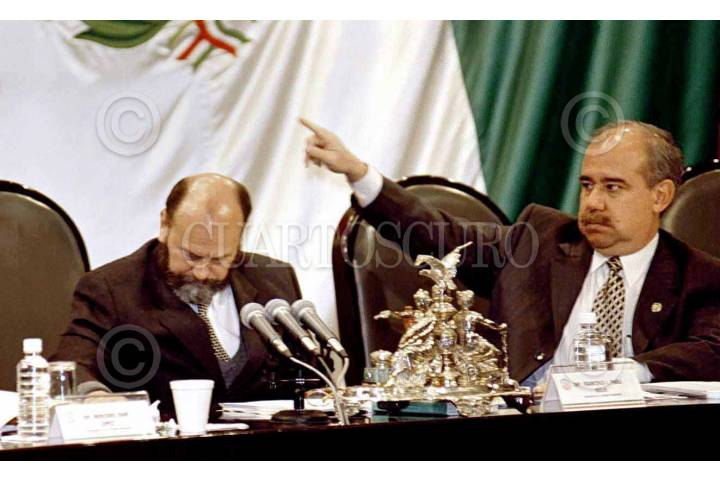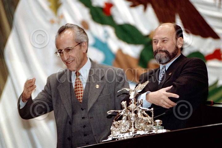 El presidente Ernesto Zedillo y el diputado panista Jose Francisco Paoli durante el informe que rindieron los legisladores al ejecutivo por el inicio de funciones de la comisión permanente.