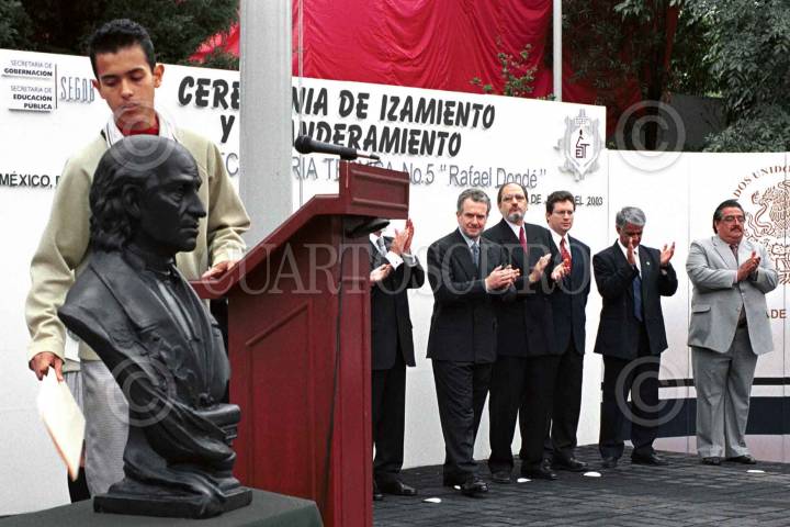 El secretario de gobernación, Santiago Creel Miranda y José Francisco Paoli Bolio, subsecretario de desarrolo político, durante la ceremonia de izamiento y abanderamiento, en la Secundaria Técnica 5, Rafael Dondé. FOTO: Moisés Pablo/CUARTOSCURO.COM