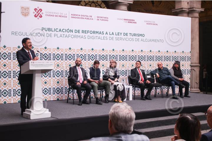 CIUDAD DE MÉXICO, 04ABRIL2024.- Martí Batres Guadarrama, jefe de gobierno de la Ciudad acompañado de funcionarios encabezó la presenración de la Ley de Turismo Regulación de Plataformas Digitales de Servicios de Alojamiento. Que se llevó a cabo en el antiguo palacio de Ayuntamiento y busca evitar la gentrificación. FOTO: ANDREA MURCIA /CUARTOSCURO.COM