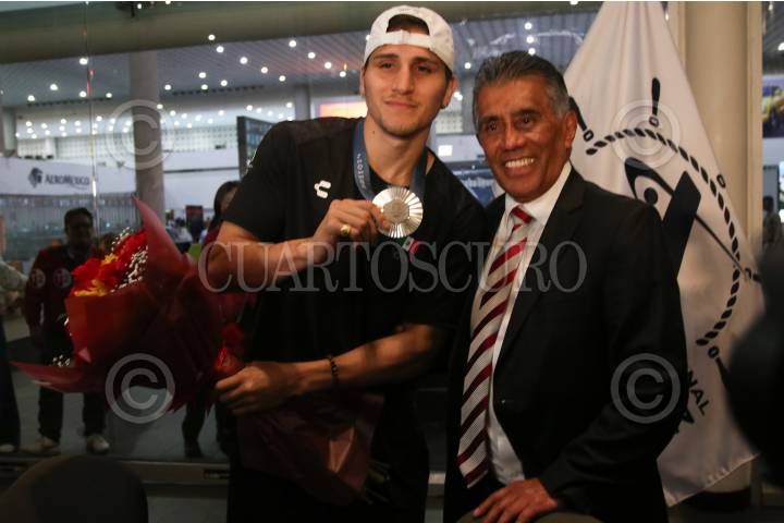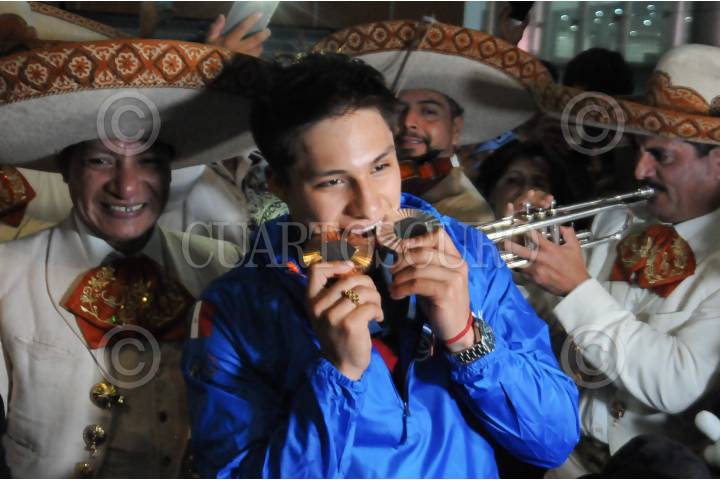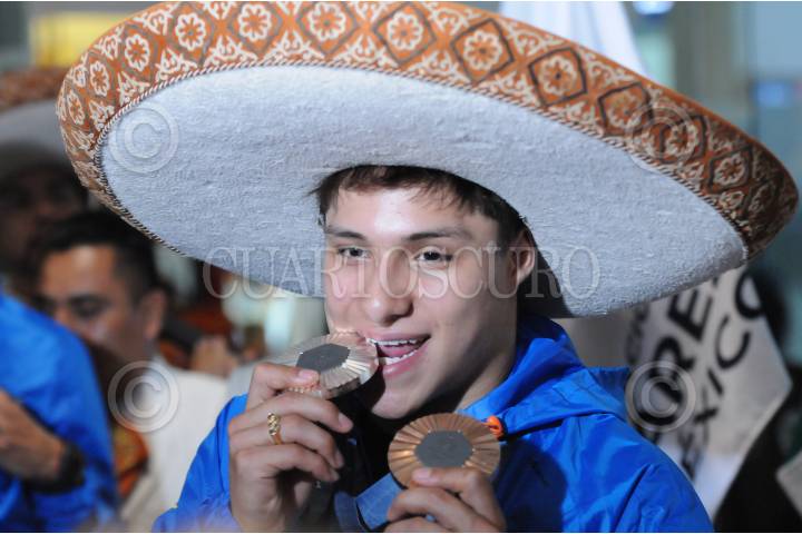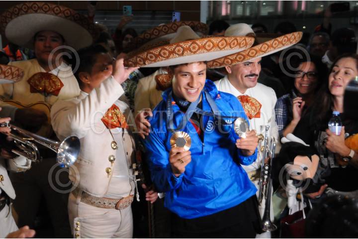 CIUDAD DE MÉXICO, 15AGOSTO2024. - Con el respaldo de sus familiares y con un grupo de mariachis fue recibido el clavadista y medallista olímpico en París 2024, Osmar Olvera, quien muestra sus medallas a las cámaras. FOTO: DANIEL AUGUSTO /CUARTOSCURO.COM