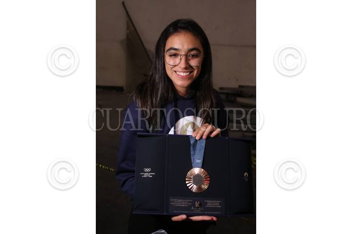 CIUDAD DE MÉXICO, 15AGOSTO2024. - Las medallas de plata y bronce que el clavadista mexicano, Osmar Olvera, ganó durante los pasados juego olímpicos de París 2024 son mostradas a los medios. FOTO: DANIEL AUGUSTO /CUARTOSCURO.COM