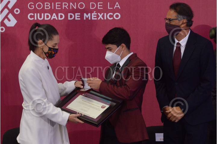 Darío Castro Pérez, durante la ceremonia de premiación a lo mejor del deporte de la Ciudad de México 2021, recibe el premio a manos de Claudia Sheinbaum, jefa de Gobierno.