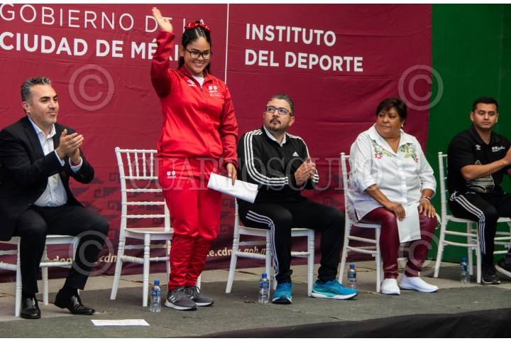 CIUDAD DE MÉXICO, 12SEPTIEMBRE2024.- El Instituto del Deporte (INDEPORTE) llevó a cabo la ceremonia de abanderamiento de los 100 atletas que participarán en los Paranacionales CONADE, a celebrarse del 18 de septiembre al 8 de octubre con sede en Oaxaca y subsede en Hidalgo. En esta ocasión, los deportistas capitalinos competirán en 8 de las 11 disciplinas que existen en los Paranacionales, como Para Tenis de Mesa, Para Baloncesto, Fútbol de Ciegos y Débiles Visuales, Boccia, Para Atletismo, Para Natación, Goalball y Paratriatlón. En su intervención, la ganadora de bronce en los Juegos Olímpicos de París 2024 y Multi Medallista Paralímpica de la Ciudad de México en la disciplina de Para Powerlifting, Amalia Pérez Vázquez, instó a los abanderados a que entreguen lo mejor de sí mismos, a creer en sus sueños y objetivos, y les deseó éxito en las próximas contiendas. FOTO: INDEPORTES/CUARTOSCURO.COM
