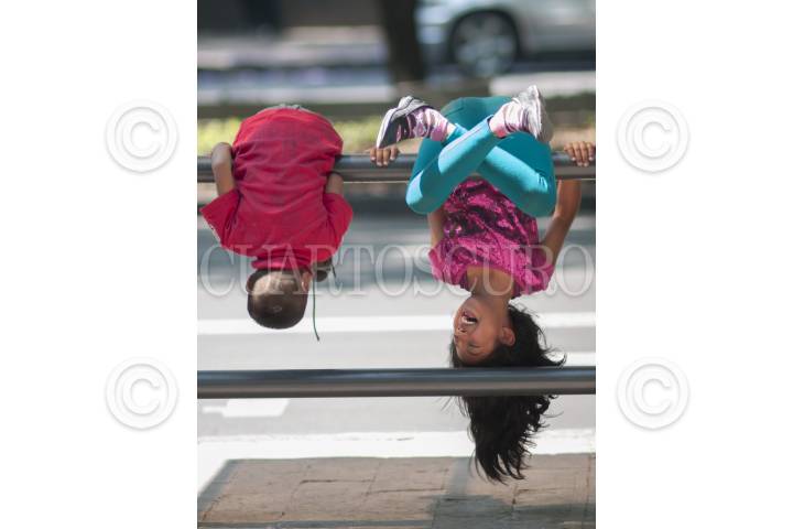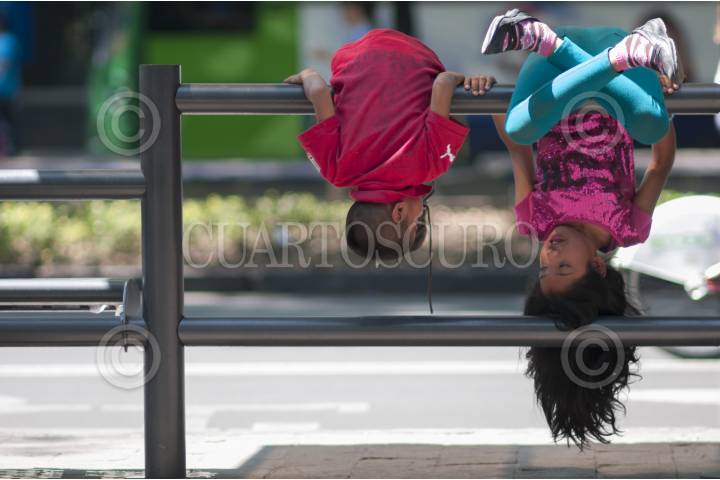 MÉXICO, D.F., 13ABRIL2014.- Dos niños juegan en el soporte de una parada del camión que está sobre Avenida Reforma casi esquina con circuito Ghandi, en la colonia Polanco. FOTO: IVÁN STEPHENS /CUARTOSCURO.COM