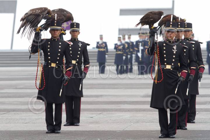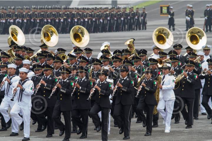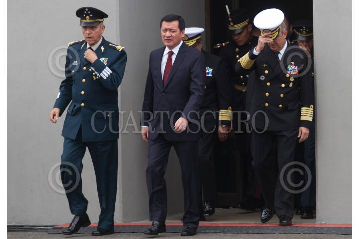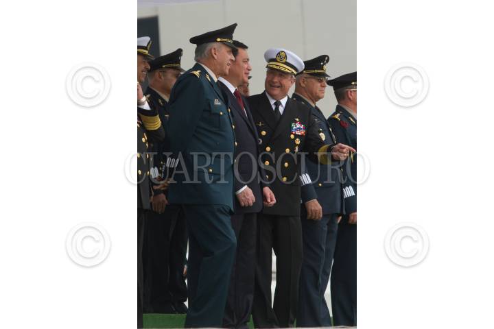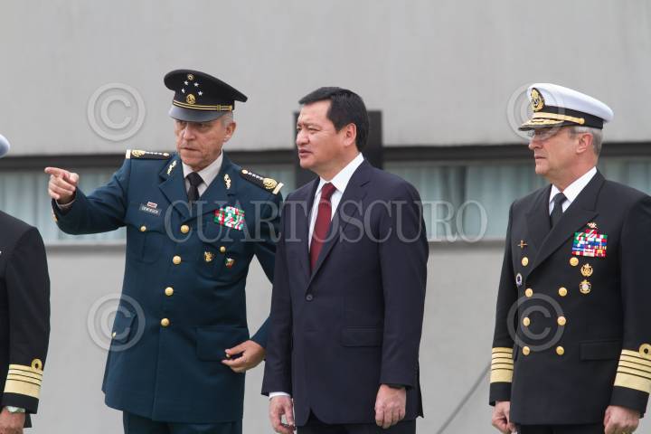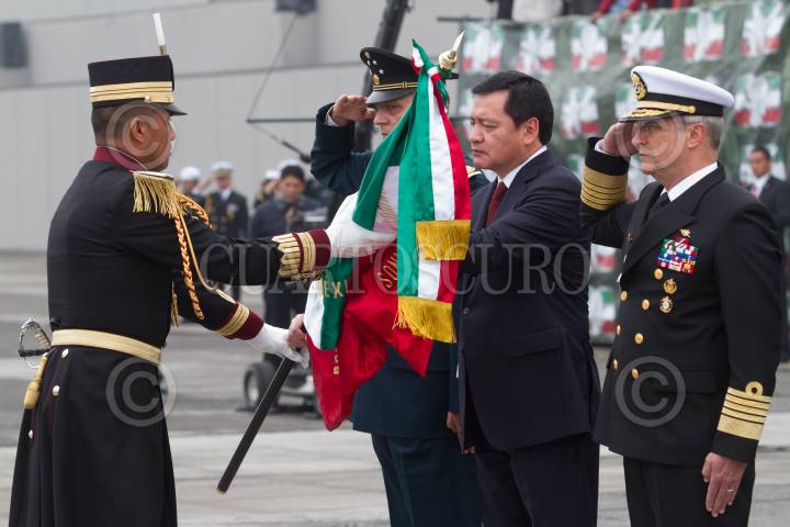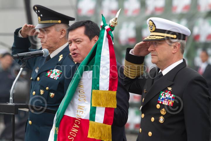 MÉXICO, D.F., 27JUNIO2015.- Miguel Osorio Chong, Secretario de Gobierno, a nombre del Jefe del Ejecutivo, acompañado de los secretarios de la Defensa y Marina, Salvador Cienfuegos y Vidal Francisco Soberón, respectivamente, abanderó los contingentes que partirá a Francia para participar en el desfile militar para conmemorar la Toma de la Bastilla, la feria más importante del país galo. Un total de 158 varones y 38 mujeres del Heroico Colegio Militar, la Heroica escuela Naval Militar, el Colegio del Aire y la División de Gendarmería de la Policía Federal, viajarán a Francia. También una orquesta integrada por marinos, federales y gendarmes realizarán el viaje en donde tocarán temas emblemáticos del país. Seis águilas del Heroico Colegio Militar se integrarán al contingente que irá al viejo continente. FOTO: MOISÉS PABLO /CUARTOSCURO.COM