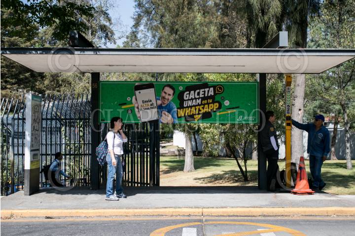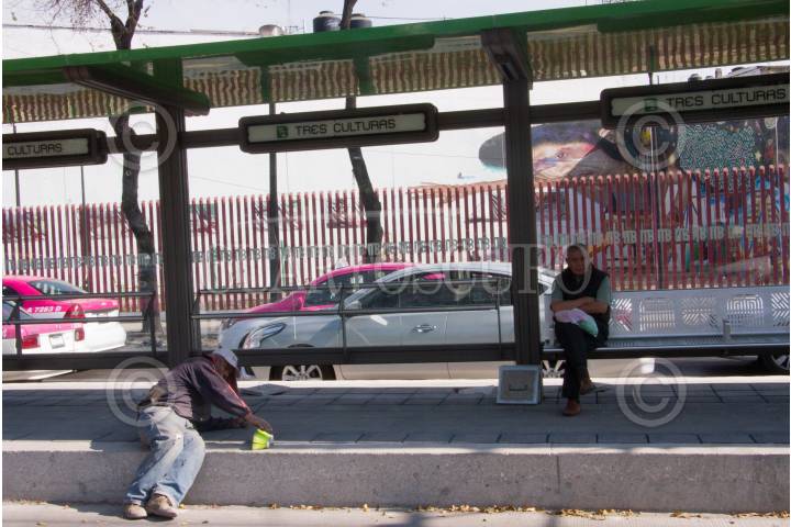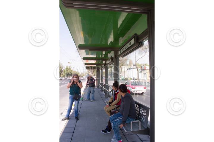 Figura de spray y humanos esperan el camión en una parada de Cuernavaca.