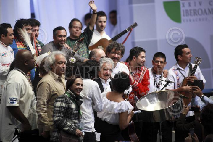 BOCA DEL RIO, VERACRUZ, 08DICIEMBRE2014.- José Mujica, Presidente de Uruguay luego de ser ovacionado por un ensamble de músicos que participaron en la XXIV Cumbre Iberoamericana. FOTO: FÉLIX MÁRQUEZ /CUARTOSCURO.COM