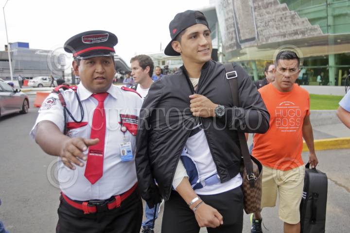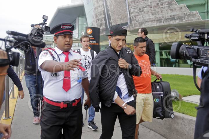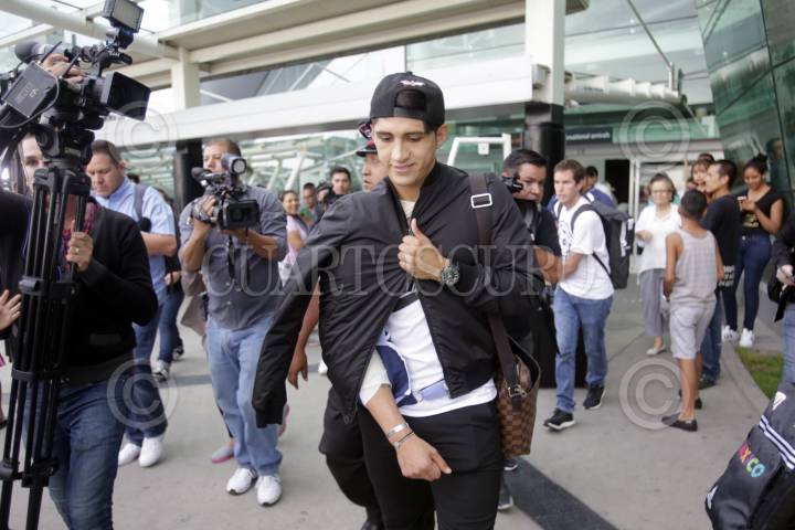 TLAJOMULCO DE ZUÑIGA, JALISCO. 03JULIO2017.- Alan Pulido, delantero de Chivas, arribo la tarde de ayer al Aeropuerto Internacional de Guadalajara, después de la lesión que sufrió en el humero del brazo derecho durante el juego ante Paraguay el fin de semana pasado en Seattle, Estados Unidos. FOTO: FERNANDO CARRANZA GARCIA / CUARTOSCURO.COM
