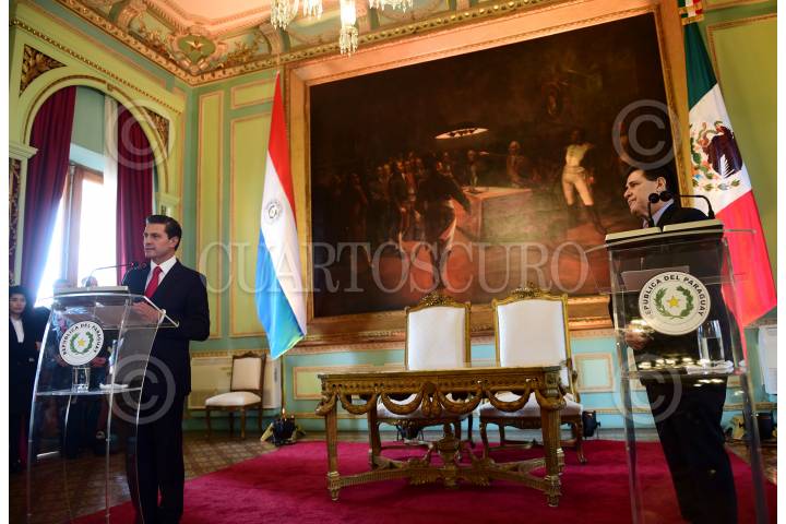 ASUNCIÓN, PARAGUAY, 18ENERO2018.- En el marco de su Visita Oficial a la República del Paraguay, el Presidente Enrique Peña Nieto sostuvo una reunión de trabajo con su homólogo de esta nación sudamericana, Horacio Cartes Jara, para abordar los temas prioritarios de la agenda bilateral. FOTO: PRESIDENCIA /CUARTOSCURO.COM