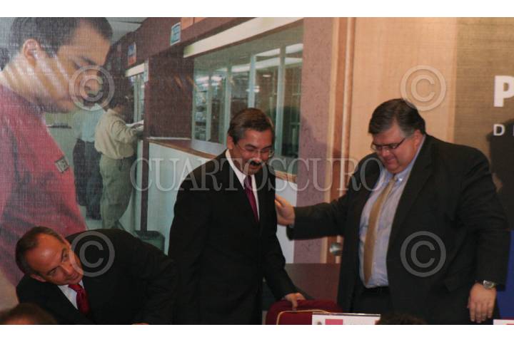 MÈXICO, D.F. 06MARZO2007.- El presidente Felipe Calderòn Hinojosa, José Natividad González Parás, gobernador del estado de Nuevo León y Agustìn Carstens, titular de la secretarìa de Hacienda y Crèdito Pùblico durante la presentaciòn del programa de modernizaciòn de los registros pùblicos de la propiedad. FOTO: PAOLA HIDALGO/CUARTOSCURO.COM