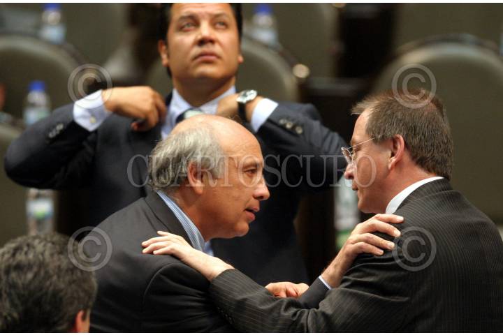 MÉXICO, D.F., 20MARZO2007.- Los diputados José Murat y Juan Manuel Paras González, durante la sesión en la que se iba a dar primera lectura a la llamada Ley del ISSSTE. FOTO: MOISÉS PABLO/CUARTOSCURO.COM