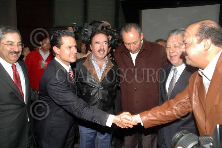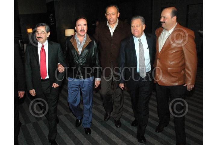 MÉXICO, D.F., 30ENERO2009.- José Reyes Baeza, gobernador de Chihuahua, José Natividad González Paras, gobernador de Nuevo León, Cesar Duarte Jáquez, Presidente de la Mesa Directiva de la Cámara de Diputados, Emilio Gamboa Patrón, coordinador de los diputados priistas, Enrique Peña Nieto, gobernador del Estado de México y Jesús Aguilar Padilla, gobernador de Sinaloa, durante los trabajos de la Reunión Plenaria del Grupo Parlamentario del PRI LX Legislatura, esta se realizó en un hotel del Centro Histórico. FOTO: IVÁN MENDEZ/CUARTOSCURO.COM