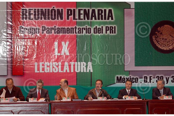 MÉXICO, D.F., 30ENERO2009.- José Natividad González Paras, gobernador de Nuevo León, Enrique Peña Nieto, gobernador del Estado de México, Emilio Gamboa Patrón, coordinador de los diputados federales priistas, José Reyes Baeza, gobernador de Chihuahua, Jesús Aguilar Padilla, gobernador de Sinaloa y Cesar Duarte Jáquez, Presidente de la Mesa Directiva de la Cámara de Diputados, durante los trabajos de la Reunión Plenaria del Grupo Parlamentario del PRI LX Legislatura, esta se realizó en un hotel del Centro Histórico. FOTO: IVÁN MENDEZ/CUARTOSCURO.COM