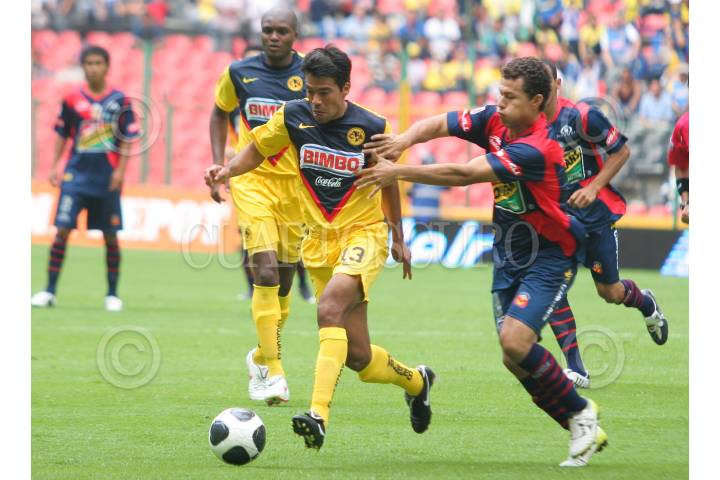 MÉXICO, D.F., 17ENER02010.- El americanista Pavel Pardo disputa el balon con Oscar Mascorro, representante del San Luis, durante el arranque en el Torneo Bicentenario 2010, jugado en la cancha del Estadio Azteca con un marcador final de 5-1 favor América. FOTO:SASHENKA GUTIERREZ/CUARTOSCURO.COM