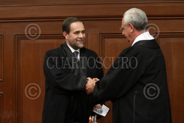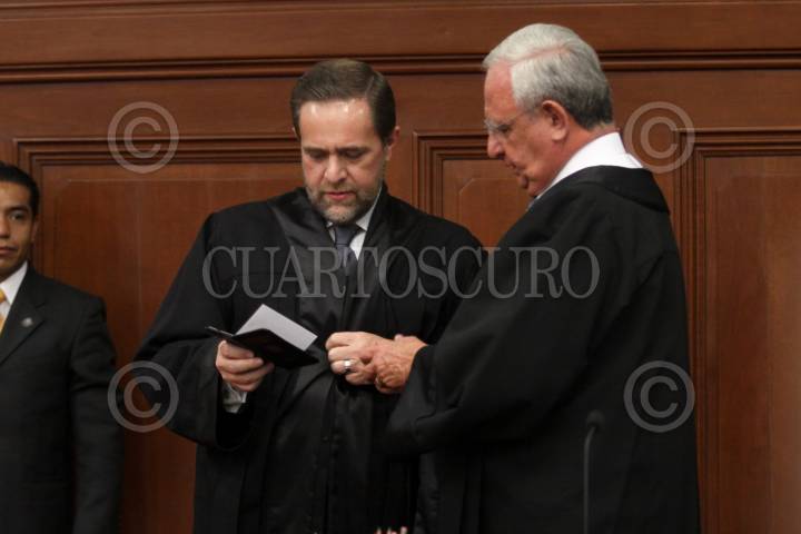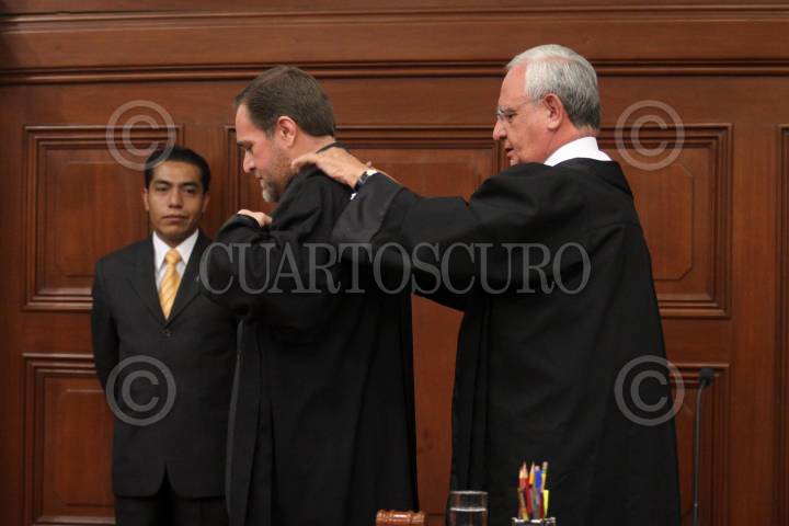 MÉXICO, D.F., 15FEBRERO2011.- El ministro presidente de la Corte, Juan N. Silva Meza, le impuso la toga al ministro Jorge Mario Pardo Rebolledo en una ceremonia de bienvenida en sesión solemne de la Suprema Corte de Justicia de la Nación. FOTO: RODOLFO ANGULO/CUARTOSCURO.COM