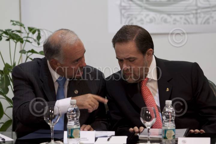 MÉXCO, D.F., 28SEPTIEMBRE2011.- El senador Alejandro González Alcocer conversa con el ministro Jorge Mario Pardo Rebodello durante la inauguración del foro Reforma Penitenciaria y Arraigo, Acciones Urgentes Frente a la Reforma Constitucional en Derechos Humanos que se realizo en el Senado de la República. FOTO: RODOLFO ANGULO/CUARTOSCURO.COM