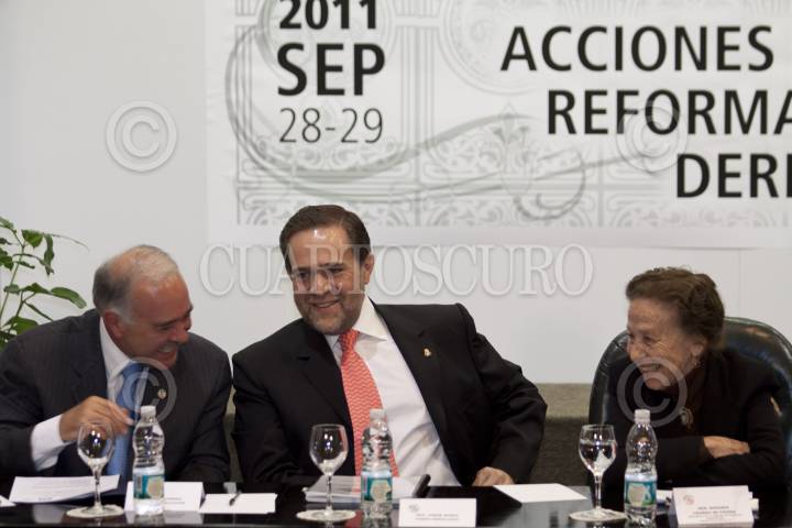 MÉXCO, D.F., 28SEPTIEMBRE2011.- El senador Alejandro González Alcocer conversa con el ministro Jorge Mario Pardo Rebodello y con la senadora Rosario Ybarra durante la inauguración del foro Reforma Penitenciaria y Arraigo, Acciones Urgentes Frente a la Reforma Constitucional en Derechos Humanos que se realizo en el Senado de la República. FOTO: RODOLFO ANGULO/CUARTOSCURO.COM