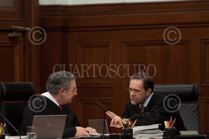 MÉXICO, D.F., 29SEPTIEMBRE2011.- Jorge MArio Pardo Rebolledo, y Luis Aguilar Morales, durante la sesión en la cual se votó el proyecto que pretendía invalidar la reforam sobre la protección a la vida desde la concepción de la Constitución de San Luis Potosí. Ante una mayoría insuficiente de siete ministros que se pronunciaron por invalidar el artículo 16 de la Constitución potosina, la acción de inconstitucionalidad promovida por una minoría de la legislatura local fue desestimada. La minoría integrada por los ministros Jorge Pardo, Guillermo Ortiz, Salvador Aguirre y Margarita Luna, privó al bloque mayoritario del octavo voto necesario para una declaración de invalidez, como sucedió en el caso de Baja California. FOTO: MOISÉS PABLO/CUARTOSCURO.COM
