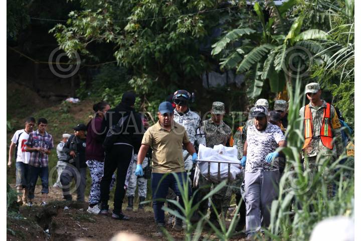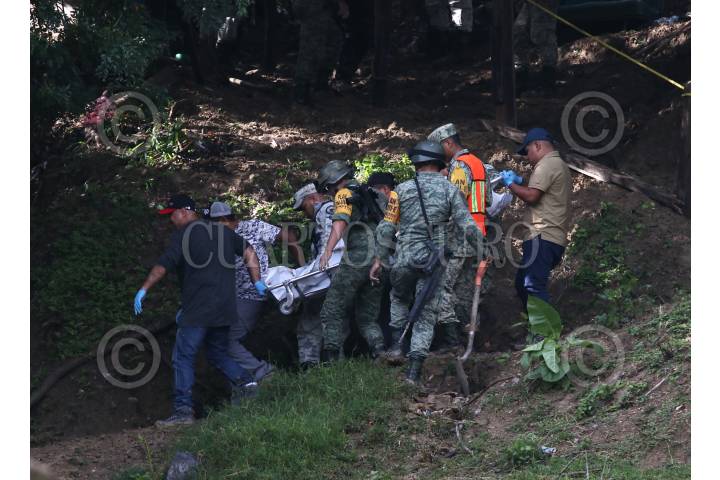 JIUTEPEC, MORELOS, 31AGOSTO2024.- La fuerte tormenta de la madrugada de este día ocasionó que un paredón se viniera abajo, sepultado dos humildes casas, donde lamentablemente tres niñas de 2, 5 y 7 años fallecieron. Los hechos ocurrieron en la colonia Jardín Juárez, también tres hombres y una mujer resultaron lesionados. Según información de algunos habitantes de la zona, aproximadamente a las tres de la madrugada el escombro y tierra sepultó la pequeña habitación hecha de lámina, cartón, polines, plástico y algunos tabiques. Los vecinos ayudaron a rescatar a la familia sin embargo las menores quedaron atrapadas. En los trabajos de rescate participó personal de Protección Civil, Bomberos, del Ejército Mexicano, Guardia Nacional, Comisión Estatal de Seguridad (CES), Escuadrón de Rescate y Urgencias Médicas (ERUM), Cruz Roja Mexicana así como Protección Civil del municipio y agentes policíacos. Otras tres casas edificadas en la zona presentan riesgo, por lo que se habilitó un albergue para esas familias ya que se pronostican más lluvias en las próximas horas. En la imagen, levantamiento del cadáver de una de las niñas realizado por personal del SEMEFO y elementos castrenses y de rescate. FOTO: MARGARITO PÉREZ RETANA/CUARTOSCURO.COM