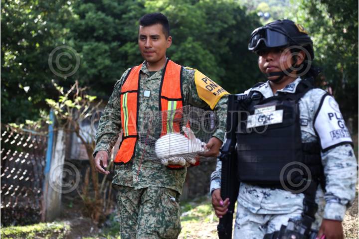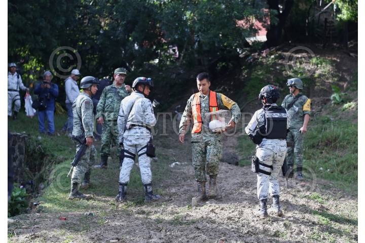 JIUTEPEC, MORELOS, 31AGOSTO2024.- La fuerte tormenta de la madrugada de este día ocasionó que un paredón se viniera abajo, sepultado dos humildes casas, donde lamentablemente tres niñas de 2, 5 y 7 años fallecieron. Los hechos ocurrieron en la colonia Jardín Juárez, también tres hombres y una mujer resultaron lesionados. Según información de algunos habitantes de la zona, aproximadamente a las tres de la madrugada el escombro y tierra sepultó la pequeña habitación hecha de lámina, cartón, polines, plástico y algunos tabiques. Los vecinos ayudaron a rescatar a la familia sin embargo las menores quedaron atrapadas. En los trabajos de rescate participó personal de Protección Civil, Bomberos, del Ejército Mexicano, Guardia Nacional, Comisión Estatal de Seguridad (CES), Escuadrón de Rescate y Urgencias Médicas (ERUM), Cruz Roja Mexicana así como Protección Civil del municipio y agentes policíacos. Otras tres casas edificadas en la zona presentan riesgo, por lo que se habilitó un albergue para esas familias ya que se pronostican más lluvias en las próximas horas. En la imagen, un soldado lleva una jaula con un conejo que fue sacado de la zona afectada. FOTO: MARGARITO PÉREZ RETANA/CUARTOSCURO.COM