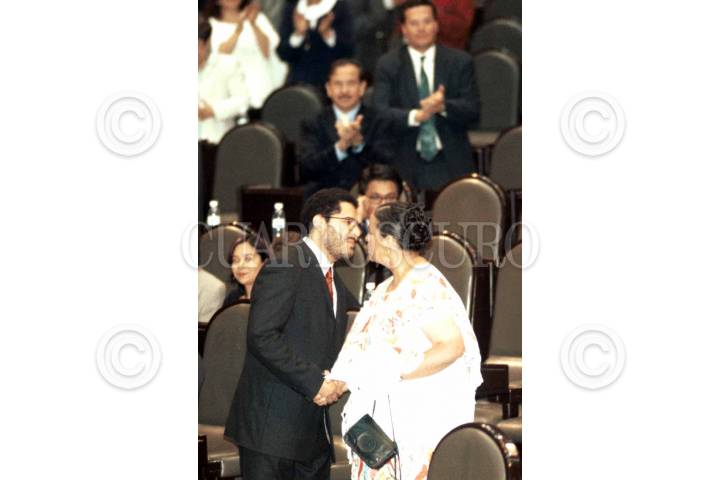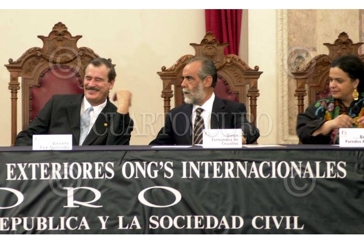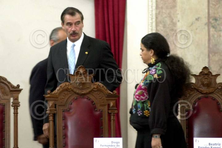 El presidente Vicente Fox, observa a Diego Fernández de Cevallos, presidente de la Mesa Directiva del Senado y Beatriz Paredes, presidente de la Mesa Directiva de la Cámara de Diputados durante la clausura del Foro " El Senado de la República y la Sociedad Civil " en el Palacio de Mineria . FOTO: Oswaldo Ramírez/CUARTOSCURO.COM