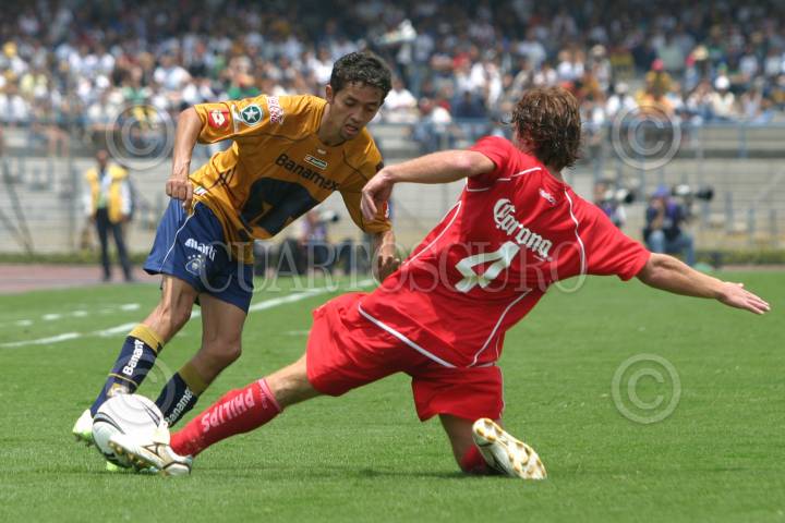 MÉXICO, D.F. 27AGOSTO2006.- Jose Luis "Parejita" López (pumas) se quita la marca Emilio Hassan (Toluca) durante el partido de la jornada 4 del Torneo de Apertura 2006 donde los Pumas de la UNAM empataron a cero goles con los Diablos de Toluca. FOTO: Iván Stephens/CUARTOSCURO.COM
