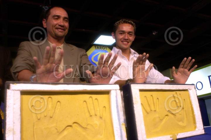 Los jugadores de Pumas José Luis "Pareja" López y su hijo el "parejita", muestran sus manos luego de plasmarlas en el paseo de las luminarias, ayer en la Plaza de las Estrellas. FOTO: Juan Pablo Zamora/CUARTOSCURO.COM