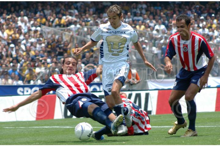 MEXICO, D.F. 07AGOSTO2005.- Jose Luis "Parejita" López se quita la marca de los jugadores de Chivas en el partido de la jornada 2 del torneo de apertura 2005 disputado en el estadio de ciudad universitaria en el que los Pumas de la UNAM se impusieron 1 gol a cero ante las Chivas Rayadas del Guadalajara. FOTO: Iván Stephens/CUARTOSCURO.COM