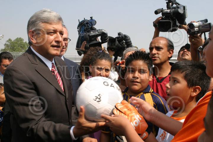 MEXICO, D.F. 13JUNIO2005.- Andrés Manuel López Obrador, jefe de gobierno capitalino, entrega un balón de futbol al equipo del Parkelectra Zaragoza para inaugurar la cancha de juego. FOTO: Sandra Perdomo/CUARTOSCURO.COM