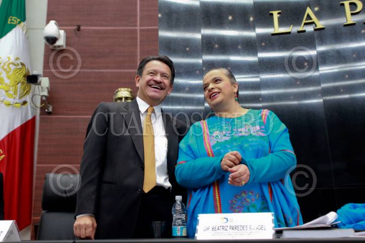 MÉXICO, D.F., 25NOVIEMBRE2011.- Carlos Navarrete Ruiz, senador del PRD, en compañía de la diputada priista Beatriz Paredes Rangel, durante su participación en la sesión inaugural de la XIII Reunión de la Comisión Parlamentaria Mixta México- Unión Europea. FOTO: CUARTOSCURO.COM