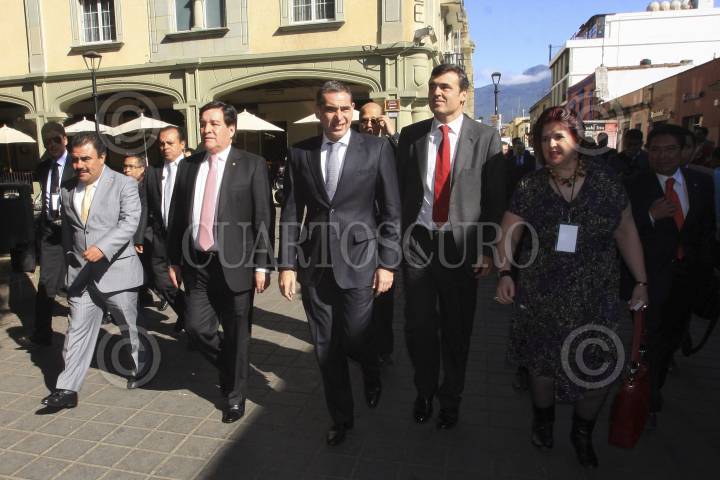 OAXACA, OAXACA, 28NOVIEMBRE2011.- El gobernador del estado, Gabino Cué, recorre las calles de la ciudad acompañando por los asistentes a la XIII Reunión de la Comisión Parlamentaria Mixta México - Unión Europea 2011. FOTO: ARTURO PÉREZ ALFONSO/CUARTOSCURO.COM