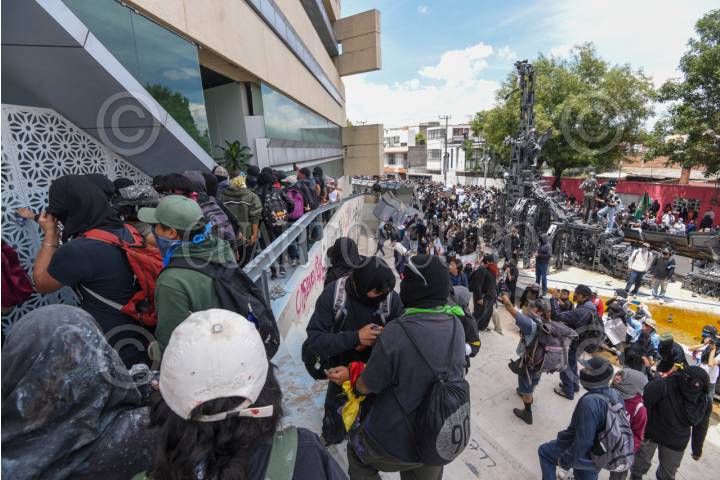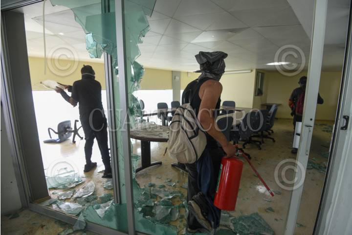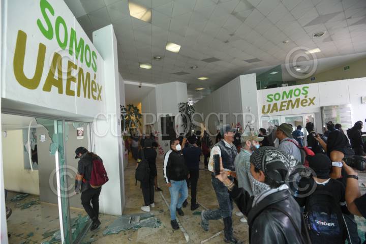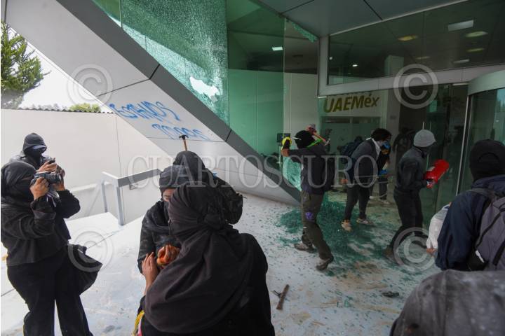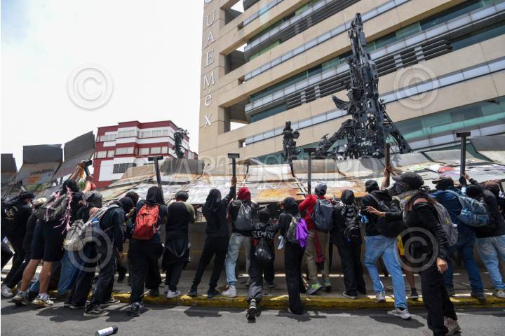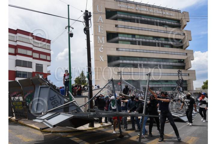 TOLUCA, ESTADO DE MÉXICO, 30MAYO2025.- Estudiantes de diversas facultades de la Universidad Autónoma del Estado de México que se mantienen en paro accionaron en el edificio administrativo de la UAEMEX. Derribaron las vallas metálicas que resguardaban el lugar, esto ante la falta de diálogo con las autoridades universitarias y el cumplimiento del pliego petitorio de los estudiantes. FOTO: CRISANTA ESPINOSA AGUILAR /CUARTOSCURO.COM