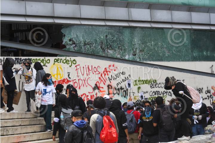 TOLUCA, ESTADO DE MÉXICO, 30 MAYO 2025.- Estudiantes de diversas facultades de la Universidad Autónoma del Estado de México que se mantienen en paro accionaron en el edificio administrativo de la UAEMEX. Derribaron las vallas metálicas que resguardaban el lugar, esto ante la falta de diálogo con las autoridades universitarias y el cumplimiento del pliego petitorio de los estudiantes. FOTO: CRISANTA ESPINOSA AGUILAR /CUARTOSCURO.COM