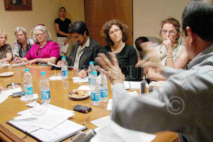 CHILPANCINGO, GUERRERO, 13MARZO2008.- Integrantes del Servicio Internacional por la Paz (SIPAZ) los estadounidenses Dale Sorensen, Camilla Schneider, Caroline Dutton y Nanette Kripke, los suizos Teresa Höchli e Irene Meier y la sueca Asa Henriksson encabezados por la coordinadora la francesa Marina Pages durante la reunion que sostuvieron en el palacio de gobierno con el secretario general de gobierno Armando Chavarria Barrera donde cuestionaron a la actual administración principalmente, en los temas del proyecto hidroeléctrico de La Parota y la militarizacion del estado, este se lavo las manos y responsabilizo al gobierno federal en ambos temas. FOTO: OSCAR ALVARADO/CUARTOSCURO.COM
