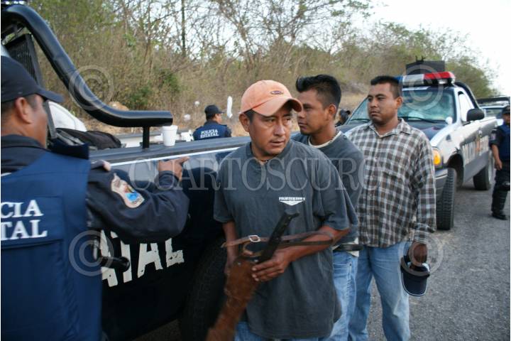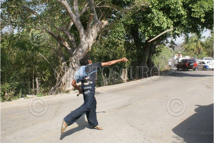 ACAPULCO, GUERRERO, 28ABRIL2010.- En medio de un dispositivo de seguridad y en un terreno cercado de la comunidad de la concepción fue aprobada por una minoría de comuneros la construcción del proyecto de la hidroeléctrica La Parota en Guerrero. A las 9:15 horas, un grupo de inconformes solicitó a las fuerzas de seguridad les dieran acceso a la asamblea y que se retirarán los policías municipales, estatales, antimotines y ministeriales, sin embargo no accedieron. Mientras tanto, unos 450 comuneros participaron en la sesión en la cual se aprobó expropiar mil 300 hectáreas y el cambio de uso del suelo del proyecto del pasado sexenio del Gobierno federal de Vicente Fox. Tras observar que al lugar acudió gente ajena a los Bienes Comunales indígenas de Cacahuatepec los manifestantes comenzaron a perseguirlos y agredirlos con piedras y palos, por lo que muchos de ellos que llegaron en taxis se retiraron del lugar. FOTO: BERNARDINO HERNÁNDEZ/CUARTOSCURO.COM
