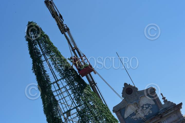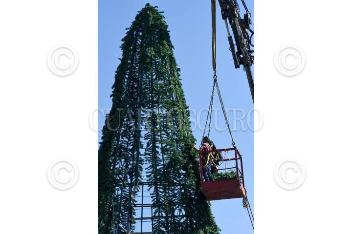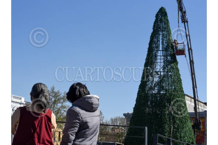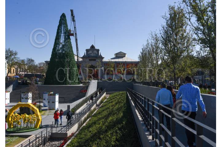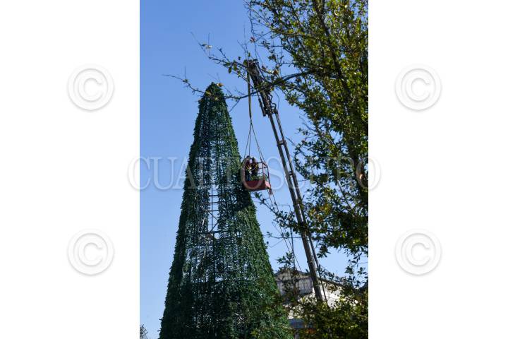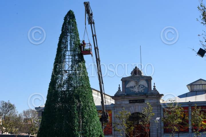 Realizan la instalación de un árbol navideño monumental como parte de los festejos decembrinos en el Parque de la Ciencia Fundadores.