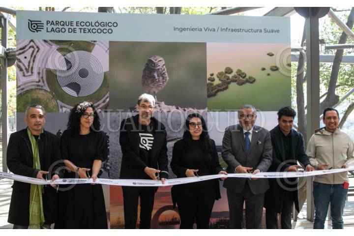 CIUDAD DE MÉXICO, 20FEBRERO2024.- Luis Uriel Dueñas Gama, Subdirección de Proyectos del Bosque de Chapultepec; la curadora Elis Mendoza; Iñaki Echeverría, director del Proyecto Parque Ecológico Lago de Texcoco (PELT), y Horacio Duarte, secretario de Gobierno del Estado de México, inauguraron la exposición fotográfica "Ingeniería Viva/Infraestructura Suave" que muestra imágenes del Parque Ecológico Lago de Texcoco, el cual esta siendo proyectado en donde el gobierno de Peña Nieto iba a construir un aeropuerto. La exposición se encuentra en la rejas del Bosque de Chapultepec sobre Reforma. FOTO: MOISÉS PABLO/CUARTOSCURO.COM