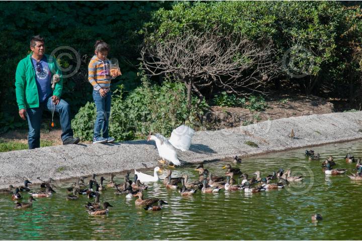 MÉXICO, D.F., 24ENERO2015.- Un padre en compañía de su hija, alimentan a una familia de patos que viven en una laguna del Parque Tezozómoc, ubicado al norte de la ciudad. FOTO: DIEGO SIMÓN SÁNCHEZ /CUARTOSCURO.COM
