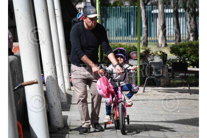 CIUDAD DE MÉXICO, 25DICIEMBRE2023.- Una niña se divierte junto a su papá en el Parque Tezozomoc, con su bicicleta que recibió de regalo de navidad. FOTO: MARIO JASSO/CUARTOSCURO.COM