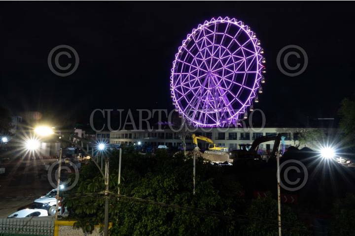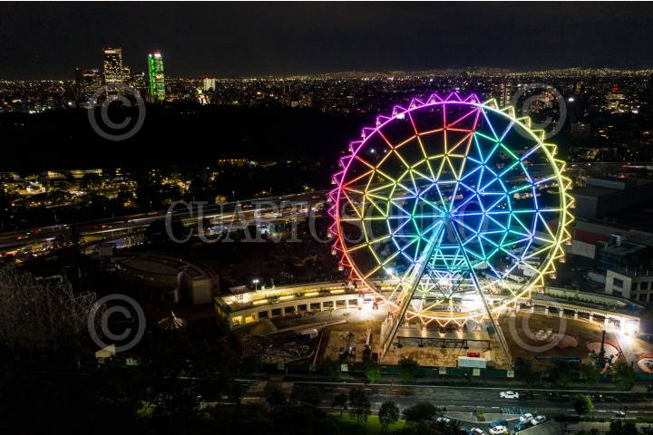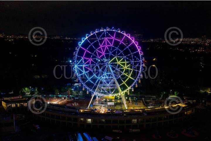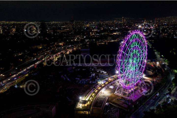 CIUDAD DE MÉXICO, 05SEPTIEMBRE2023.- Toma aérea de la Rueda de la Fortuna Aztlán 360 encendida por el jefe de gobierno de la Ciudad de México, Martí Batres Guadarrama, y José Miguel Bejos, presidente de Mota-Engil México, en el Parque Urbano Aztlán (antes Feria de Chapultepec) de la Segunda Sección del Bosque de Chapultepec. FOTO: GALO CAÑAS/CUARTOSCURO.COM