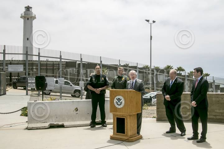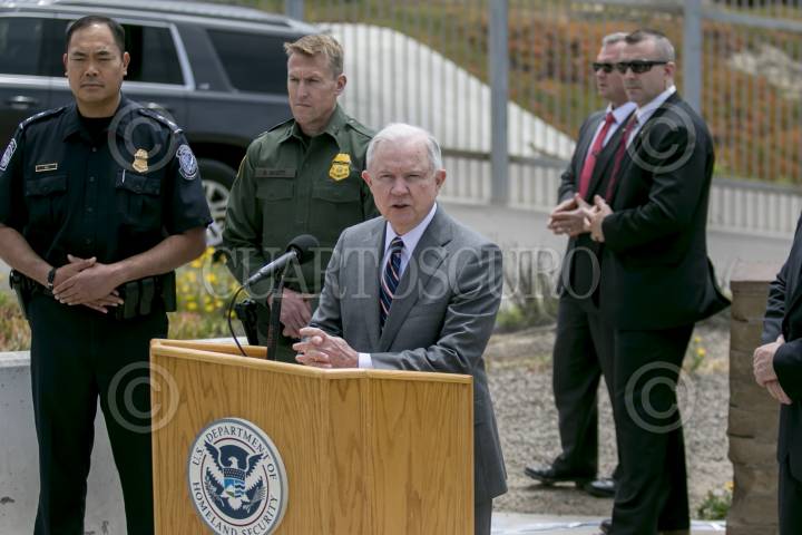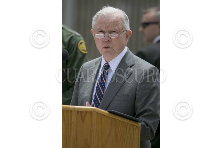 SAN DIEGO CALIFORNIA, 07MAYO2018.- El Secretario de Justicia del gobierno estadounidense, Jeff Sessions, durante su visita a la frontera, donde comentó ante medios de comunicación que las familias que entren ilegalmente a Estados Unidos serán separadas y procesadas criminalmente. La declaración se realizó en el Parque Binacional, lugar donde se implementó un fuerte dispositivo de seguridad. FOTO: CUARTOSCURO.COM