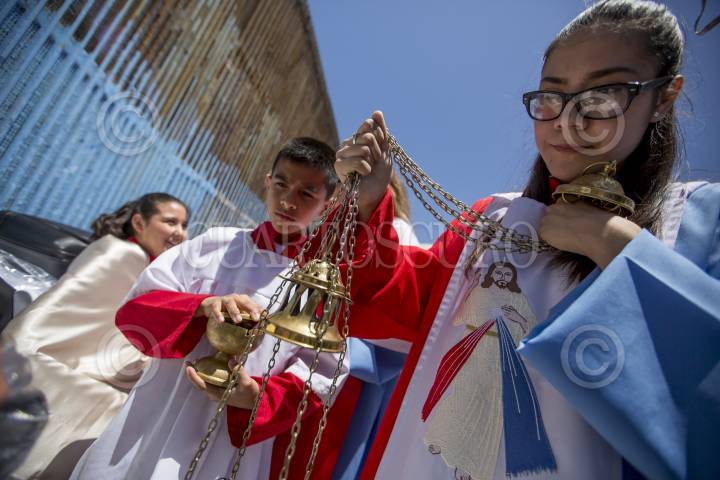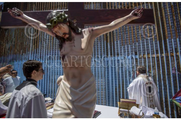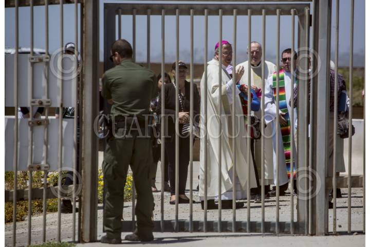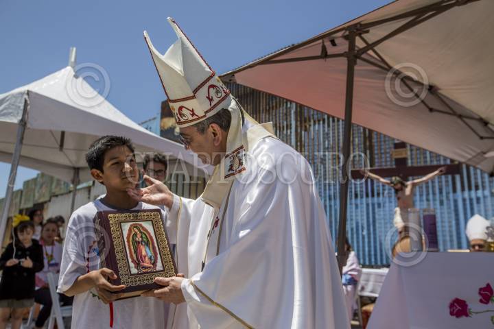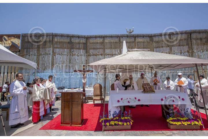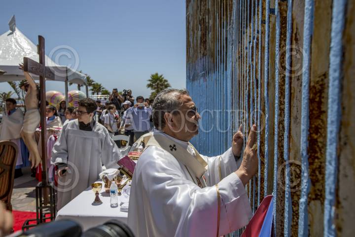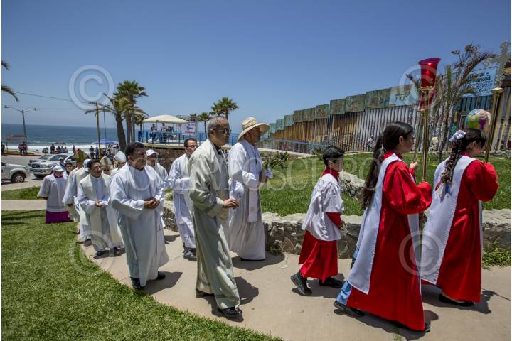 TIJUANA BAJA CALIFORNIA, 09JUNIO2018.- El Parque de la Amistad ubicado en la frontera entre México y Estados Unidos fue escenario de la Misa Binacional, representada por el arzobispo, Francisco Moreno Barrón del lado mexicano, y por el obispo Robert McElroy del estadounidense. Durante la eucaristía se hizo un llamado a eliminar la violencia contra la niñez. Al evento asistieron un centenar de fieles católicos. FOTO: OMAR MARTÍNEZ /CUARTOSCURO.COM