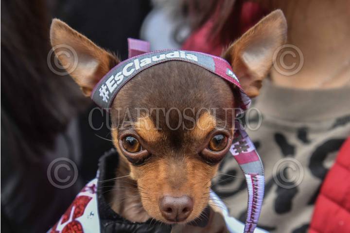 Un perrito porta una cinta con las palabras "#EsClaudia" durante la asamblea informativa que ofreció Claudia Sheinbaum, aspirante a coordinadora nacional de los comités de defensa de la Cuarta Transformación en el Parque de La Bombilla.