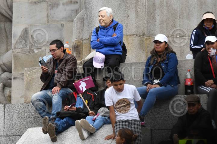 Una persona con máscara de Andrés Manuel López Obrador, presidente de México, junto a simpatizantes, observan la asamblea informativa que ofreció Claudia Sheinbaum, aspirante a coordinadora nacional de los comités de defensa de la Cuarta Transformación en el Parque de La Bombilla.