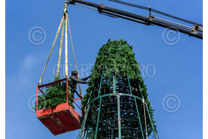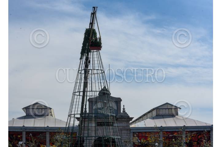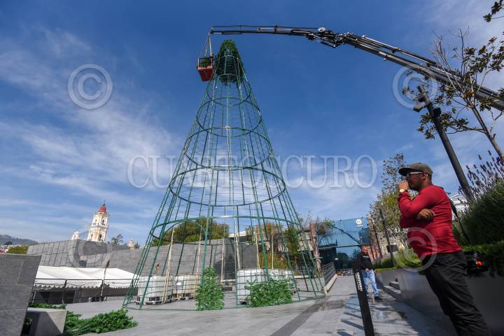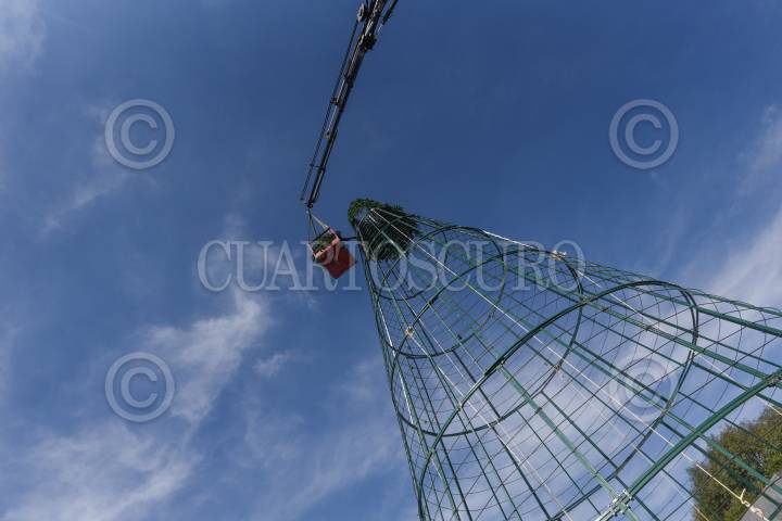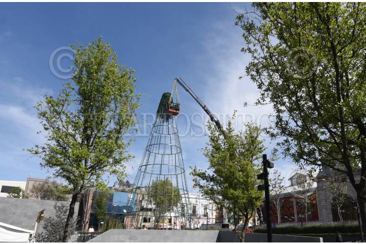 Inician los trabajos de instalación de un mega árbol navideño en el Parque de la Ciencia Fundadores en Toluca.