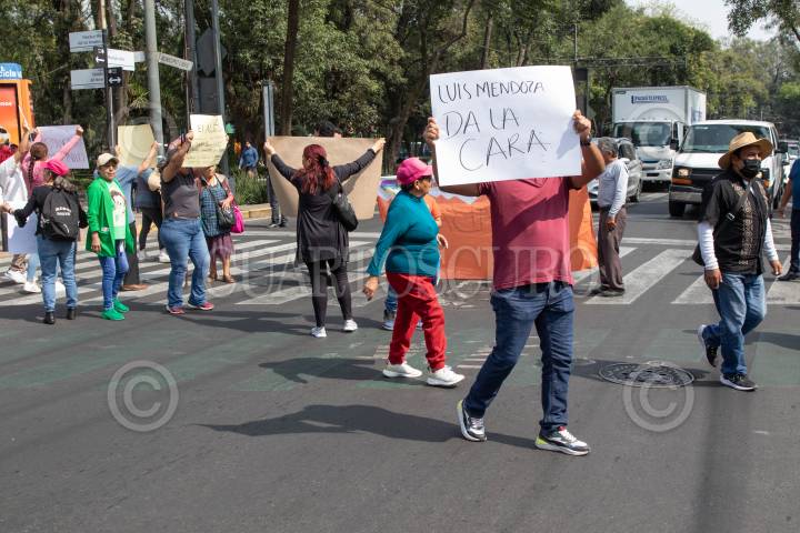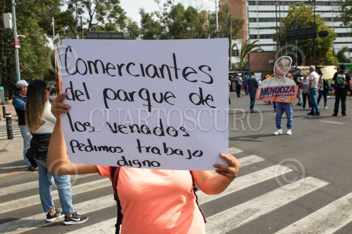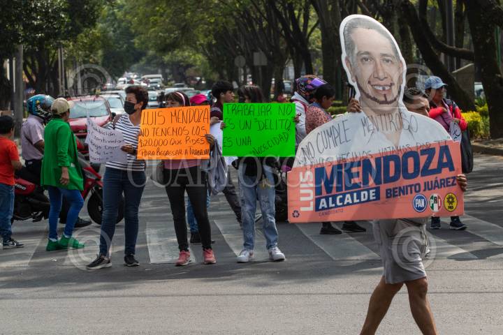 CIUDAD DE MÉXICO, 19NOVIEMBRE2024.- Comerciantes que fueron retirados del Parque de los Vendos se manifestaron bloqueando avenida División del Norte y Municipio Libre, esto para denunciar que fueron retirados por el actual alcalde de la Benito Juárez, Luis Mendoza, quien les prometió que cumplieran con una serie de lineamientos para dejarlos realizar su actividad económica en el parque pero no cumplió con lo prometido. Los ahí presentes señalaron que llevan más de dos meses sin trabajar y que se enteraron que la alcaldía pretende privatizar este espacio público y darlo en concesión a empresas privadas. Los inconformes dijeron que la mayoría de los afectados son adultos de la tercera edad y que su puesto es su único sustento. FOTO: MOISÉS PABLO/CUARTOSCURO.COM